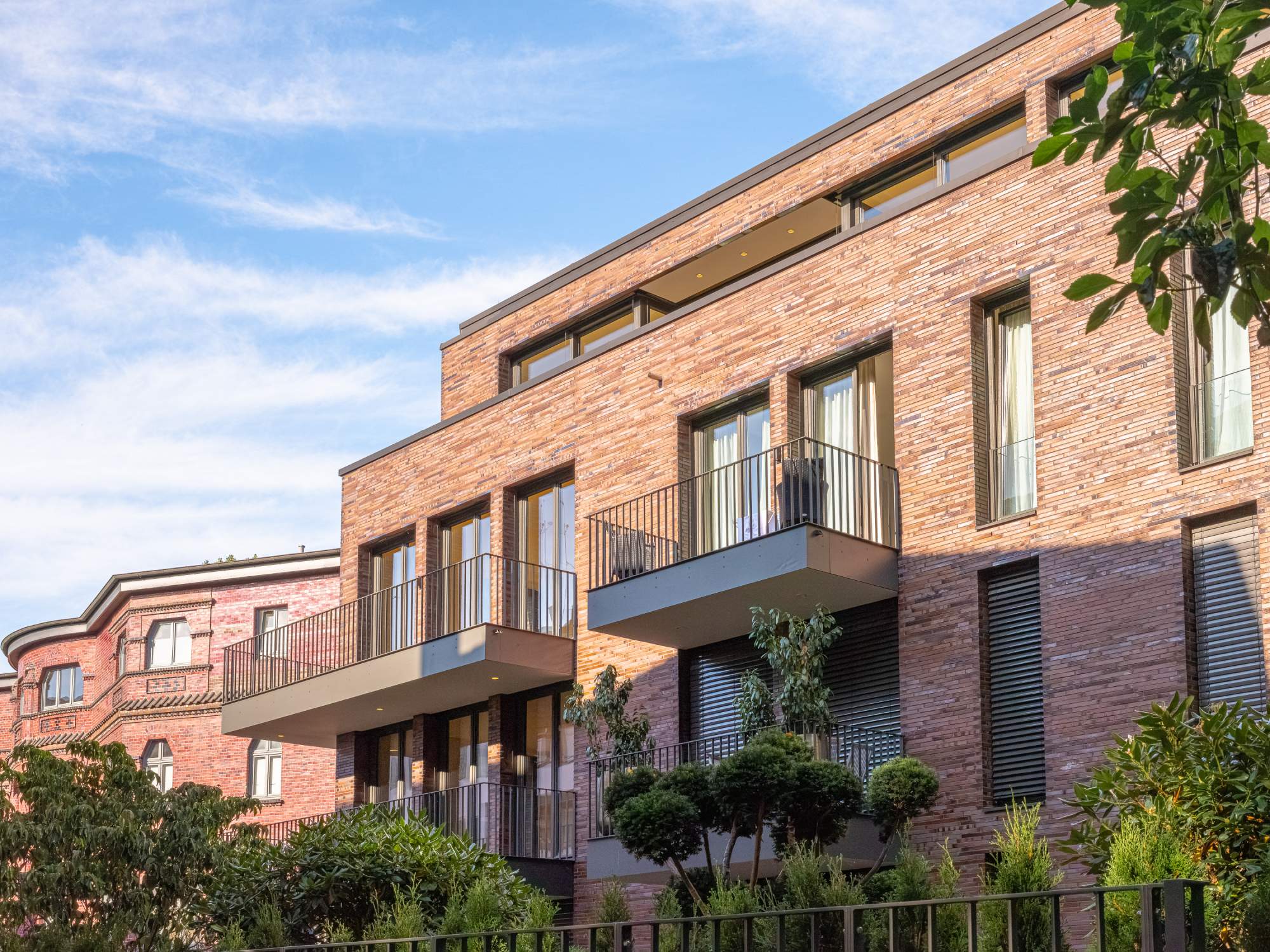 Die Fassade des Neubaus wird aus hochwertigem Klinker im Sonderformat gefertigt. Die Wandleuchten der Terrassen und Balkone sowie die Zuwegungen im Außenbereich profitieren von einem hochwertigen Beleuchtungskonzept. Auch die Innentüren und Wohnungseingangstüren wurden sorgfältig ausgewählt und sind von Neuform. Die Beschläge der Türen stammen von FSB und sind in Aluminium eloxiert. Weitere Details zu der Ausstattung der Eigentumswohnungen finden Sie unter Projekt.